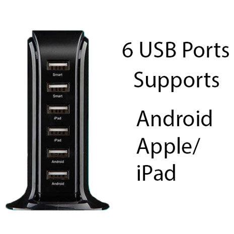 SmartPower Tower for Smart Desk that will deliver 6 USB ports and sits on your desktop and plugs directly into a power outlet. The Smart Power Tower has a built-in hi-tech chip that will determine how much power is needed when you plug in your gadget or Smartphone and deliver that many watts of power by creating an exclusive delivery tunnel that will speedily charge your device.