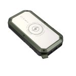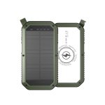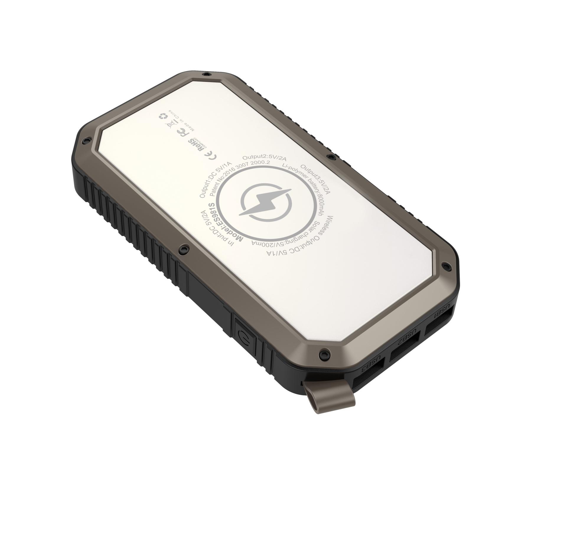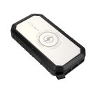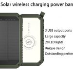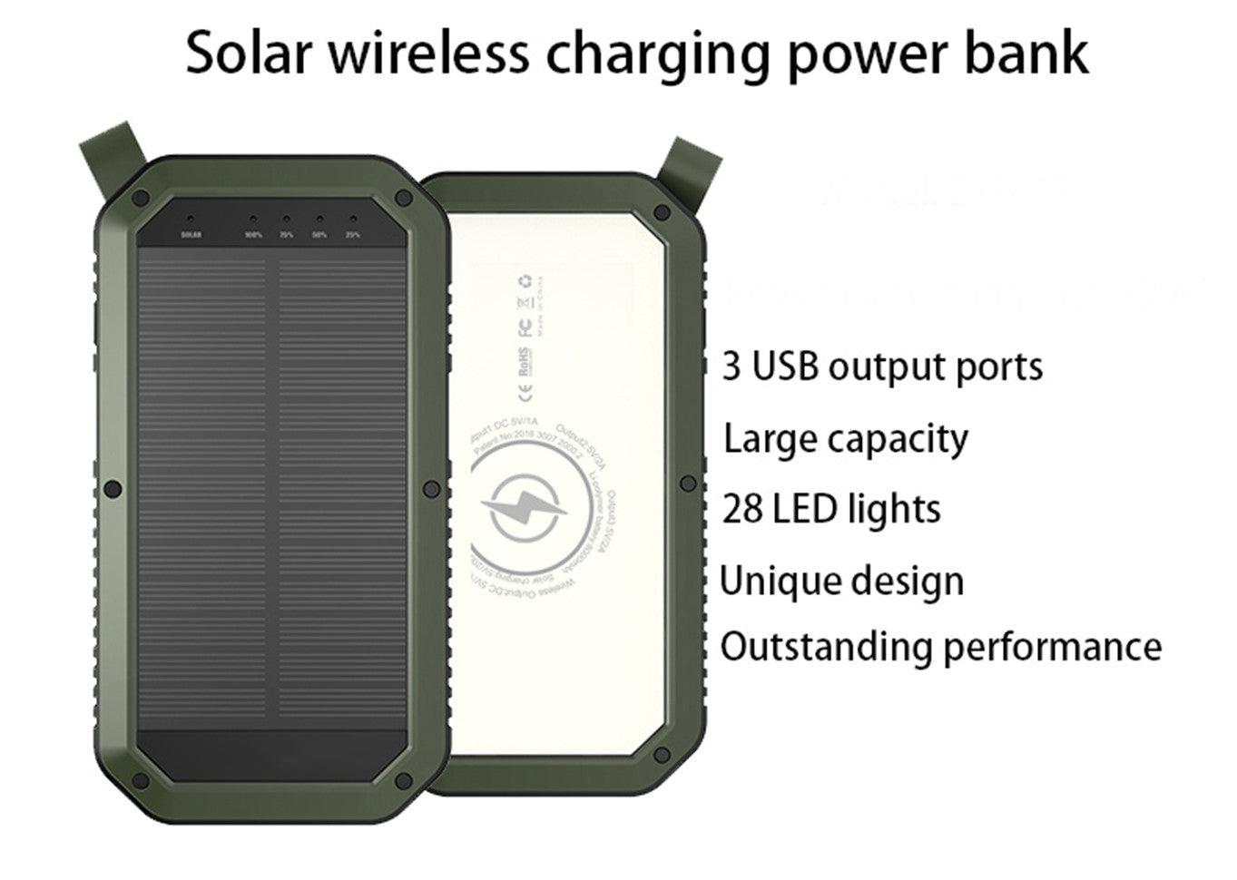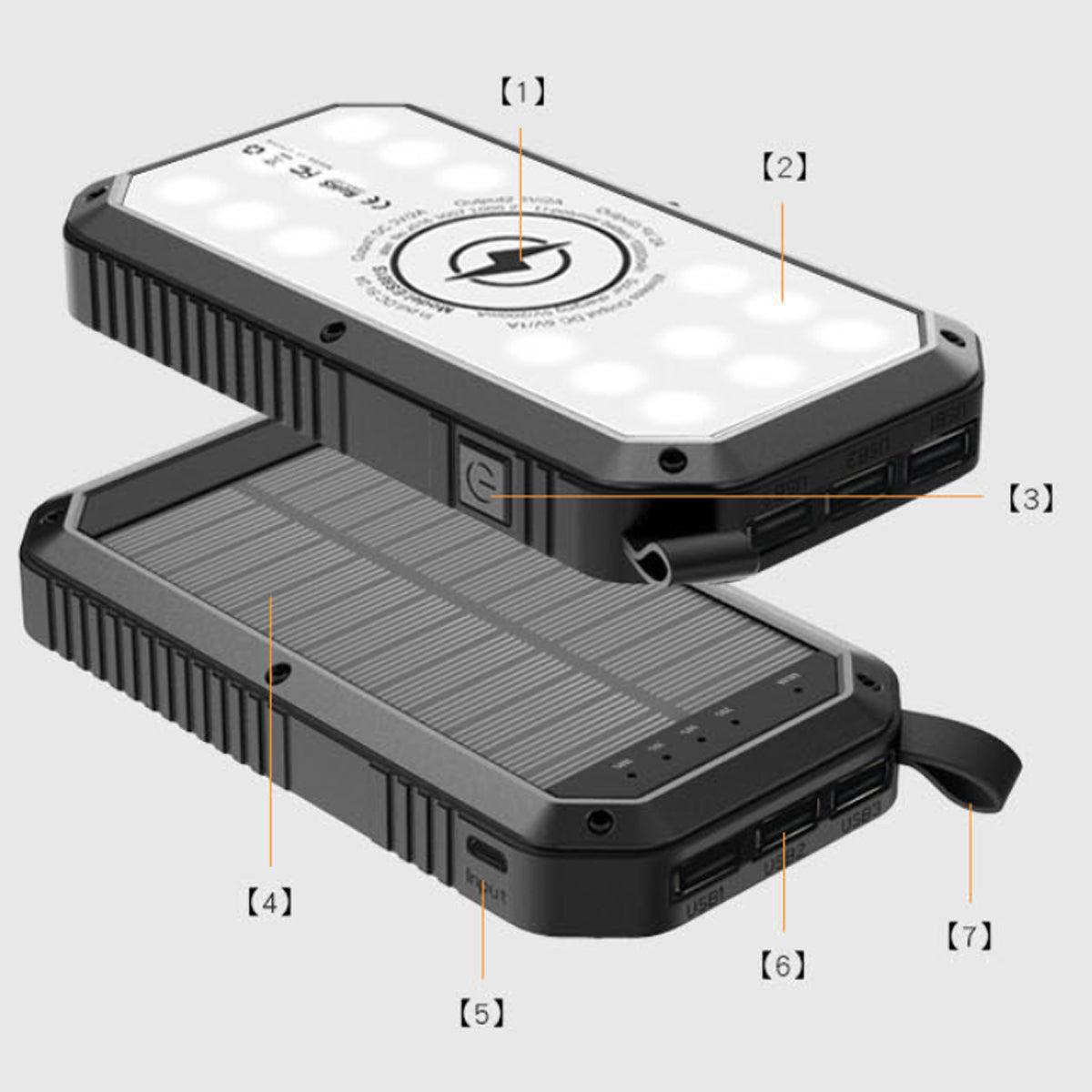 This is a 10,000 mAh capacity Solar Powerbank with a built-in wireless charger and LED floodlight. This charger with boosting charging capability can simultaneously charge 2 to 4 devices with its built-in Qi-standard wireless charger, multi-port USB ports.