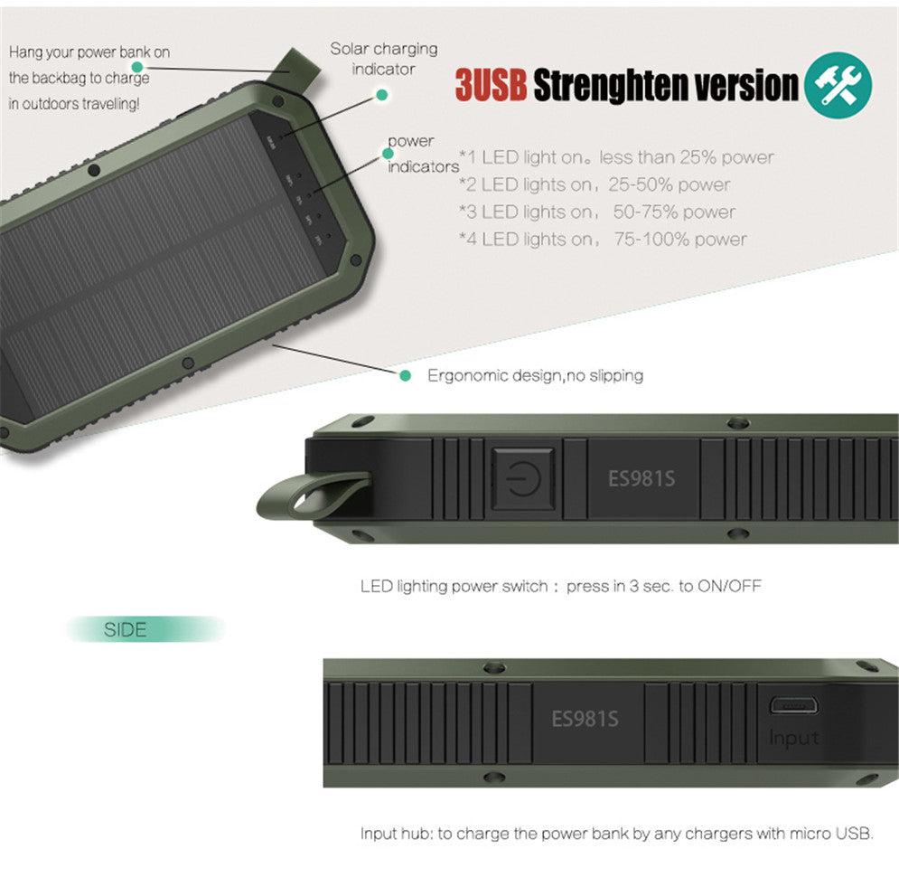The built-in power regulator will not overcharge your devices. The whole power bank is shockproof and dustproof as well as water-resistant. With this is one solar charger you feel you really have power. The advanced light-absorbing solar panels take every light source and use it to convert to stored power.