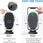 Automatic opening and clamping design which can be operated with one hand.The mount will open automatically just when the phone close to , then it will be clamped after smartphone in.Gently touch behind side of the quick release button, the holder will open automatically.After phone in the mount, the wireless charger will automatically clamp firmly and charges the device.When your phone is fully charged, the Cell Phone Car Cradles will automatically power off and pr